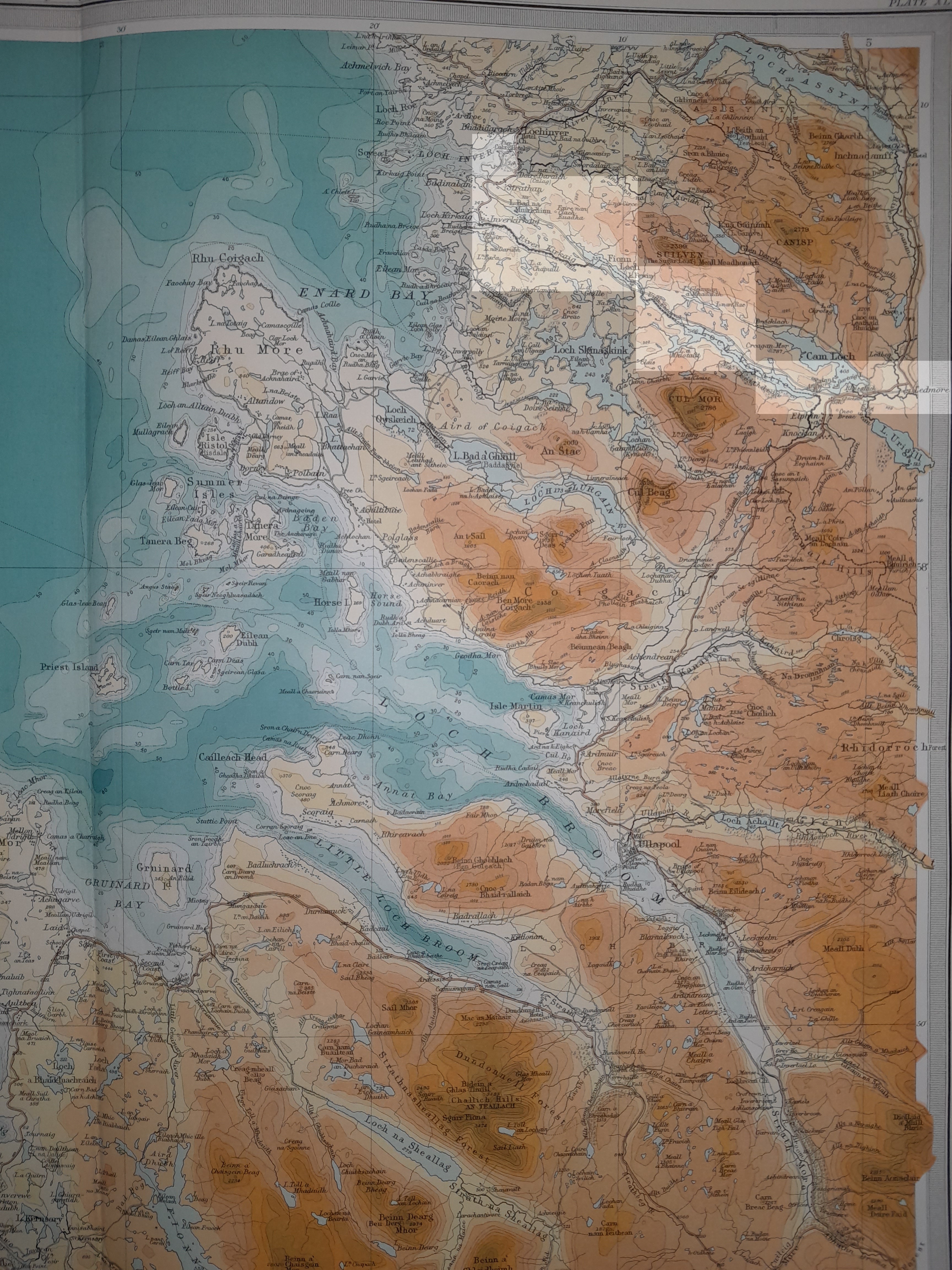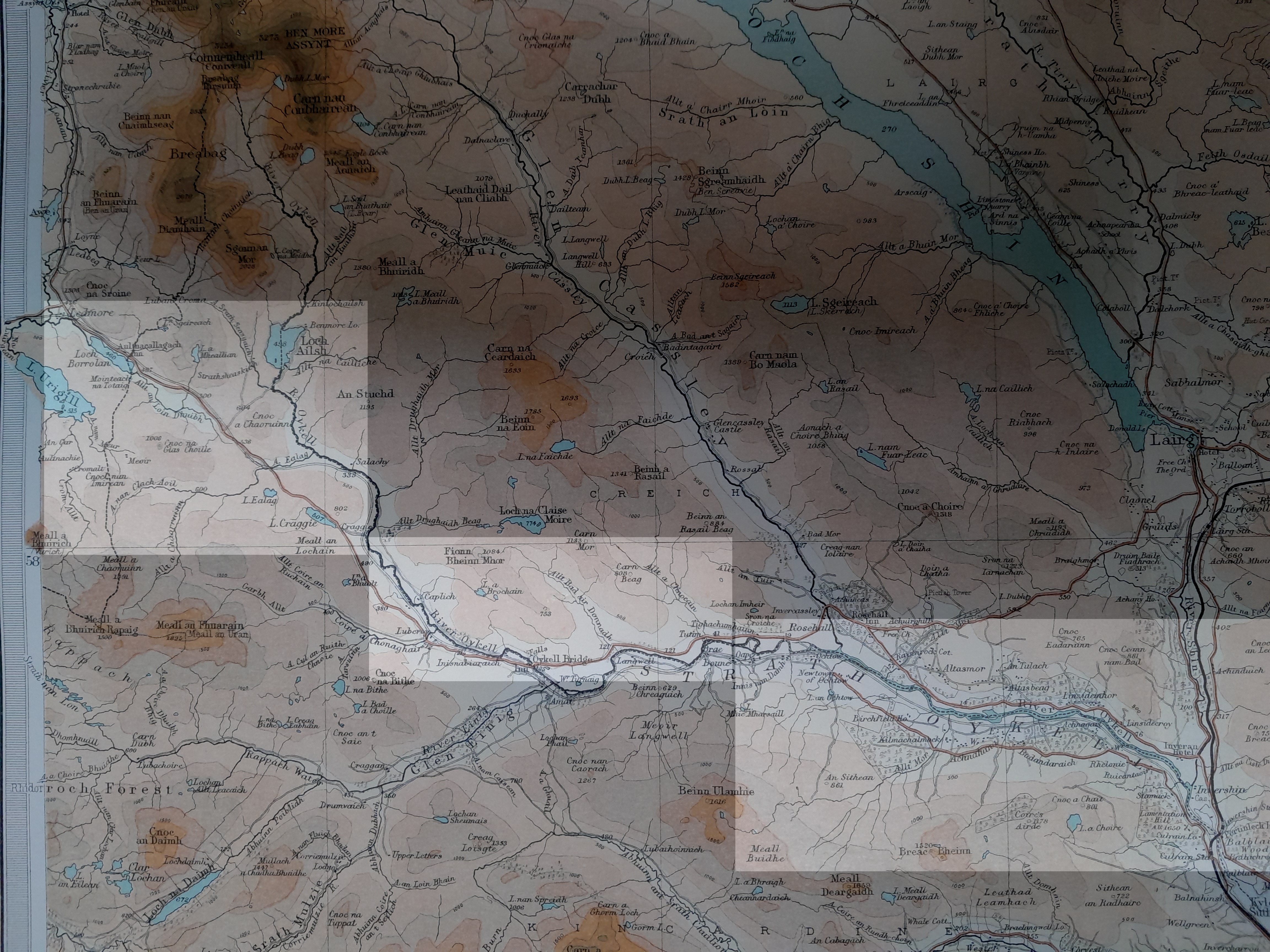 1895 map of the Culrain to Lochinver railway lineThe route proposed is an interesting one from an engineering perspective, since, from Ledmore westwards, it intends to cross rather inhospitable ground - bog, rocky outcrops, small lochs. The northern route, via Loch Assynt, admittedly seven miles longer, would have been much easier to build - and would also have passed through a couple of small pockets of human habitation, doubtless with paying passengers. But who are we to judge? (Note that this route is not the same as the one marked in the 1892 Scottish Office map, shown just above. The reason for this is that there were two possible routes to be taken, to the north or the south of Suilven mountain; and which one was recorded in reports rather depended on who you talked to last...) I am grateful to Robert V. Simon for these images. They are taken from his own copy of the 1895 Atlas. | ||