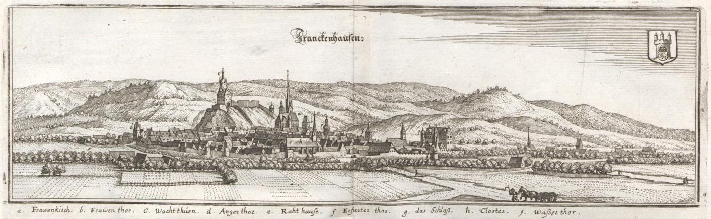 A view (Mattheus Merian, 1650) of Frankenhausen in Thuringia; the hill on the left is where the battle took place, on 15 May 1525. Universitäts- und Landesbibliothek Düsseldorf