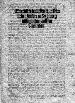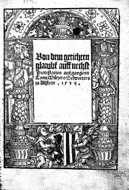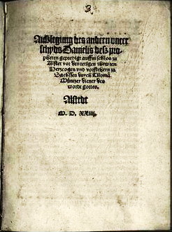 Protestation or Proposition. (November 1523). This is a work in which Müntzer sets out the basic tenets of his doctrine. A zealous expectation of the word is the first stage in becoming a Christian. This same expectation must first suffer the word and there must be no comfort in being promised eternal forgiveness because of our works. It is then that a person thinks he has no faith at all. [...]. He feels and finds a pressing need for true faith, but it is so weak that he is barely aware of it, and only then after the greatest difficulty. And finally he has to break out and say: "Oh, how miserable I am, what is going on in my heart? My conscience is devouring my juices and my strength and everything that I am. Oh, what am I to do? I am losing my mind, I have no comfort from either God or creature. God tortures me with my conscience, with disbelief, with despair and I blaspheme against him. Outwardly I am assailed by sickness, poverty, distress and every kind of need, by evil people etc. And inwardly it is even worse than that. Oh, how gladly would I embrace true faith, for everything seems to depend on it; if only I knew what was the right way. Aye, I would follow it to the end of the world." And then along come the pious scholars, if ever such dismal folk come at all [...] and they say: "Ha, my dear man, if you cannot believe, then go to the devil !" And then the poor creature replies: "Oh, most learned doctor, I would really like to believe, but my lack of faith overwhelms all my intentions. What in the world am I supposed to do?" But then the scholar says: "Well, my dear fellow, you should not bother yourself with such lofty things. All you need do is believe. Put those thoughts away. That is all idle fantasy. Go on home and be cheerful - that's the way to forget all these cares." See, dear brother, that is the kind of comfort which has prevailed in the church, that and no other... This pamphlet was also printed in Allstedt by Widemar, probably in November 1523. | ||||