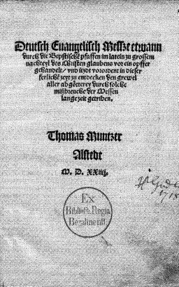 The German Evangelical Mass. (August 1524). It follows the same form as the standard 'Missale Romanum' and the local 'Missale Halberstadtiense', and the translations of the text, although distinctly Müntzerian in places, are generally quite sober. The examples given by Müntzer relate to the five main celebrations of the church year, but were to be used as models for any other Mass. In content, the 'Mass' was less controversial than the 'German Church Office', and even seemed to offer more participation for the parishioners than its predecessor. Some of the hints given out in the text, however, are significant. From these we can deduce that Müntzer was determined to ensure that the officiating preacher celebrated with his parishioners: the instructions for the celebration of communion ensure that the preacher is facing the congregation and is not, as had hitherto been the case, turned away from them; the sacrament was also to be given 'in both kinds', in the Utraquist fashion. Both of these changes caused considerable outrage. | ||||